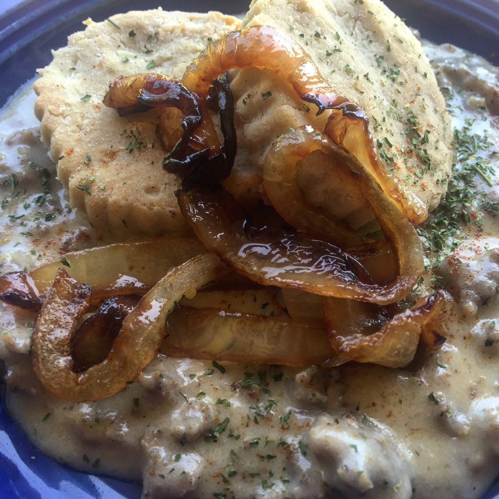 Today, I made gluten free buttermilk and sour cream biscuits, gluten free sausage gravy and caramelized onions. Delicious!